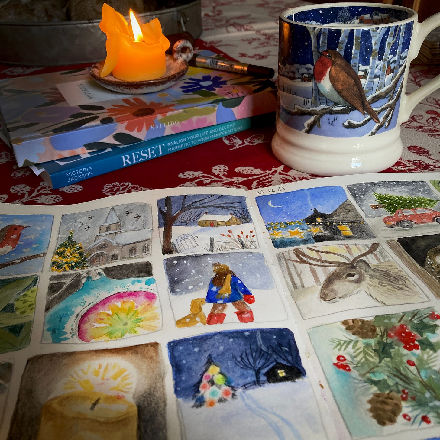 I kept my painting things out on the dining table until Christmas Eve, when I tidied them away so it could be laid for Christmas dinner the following day. I realised that I enjoyed having a pop up art space, where I could pass by and scribble a few lines, or sit for ten minutes and paint a glittering bauble or a wintery scene from my imagination. It gave me a sense of calm, and felt like the kindest of permission slips to gift myself these small moments.